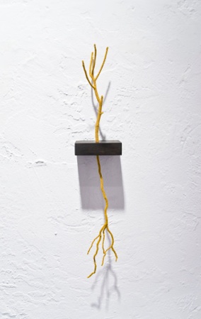 Twig, root, hand-dyed cotton thread, ebony wood shelf