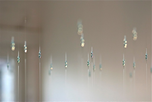 KAGAMI (“mirror” in Japanese) includes an extensive range of Tanaka’s beautifully executed glass-based artworks. Tanaka’s works draw attention to the nature of light, glass and the interplay between them, as well as to our own perception of light’s dynamic presence and effects. Mirror Surface and Morning Dew are site-specific installations comprised of numerous suspended glass droplets or spheres.They represent one of the unique directions this innovative artist has explored and for which she has become recognized over the past decade. In these mesmerizing works, she uses glass in unlikely and sometimes seemingly impossible ways, such as mimicking raindrops or filament.