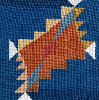 Marlene Bloomberg, who, sadly, passed away in 2013 during the planning of this exhibition, was born in Paris just before World War II. She was trained in the family business—making kepi, the distinctive flat-topped police hats—so that sewing and related skills were second nature to her. Like Bernard, she found herself living in Davis, in her case after marrying an American she met at the Sorbonne. She dedicated herself to needlepoint work, leaving approximately one hundred works in her estate. She took great pride in inventing original designs, neither strictly figurative nor landscape, and often verging on the abstract. At their most resolved, they are contemporary miniatures full of mysterious personal iconography rendered with consummate skill.