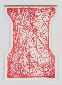Also on view are maps or diagrams of the regular routes Houlding’s truck creates with a simple set of tools, acting as a sort of after-the-fact GPS device. A shot put placed in a frame lined with inked paper ‘draws’ as the truck moves, leaving evidence of the twists and turns in the road. The resulting ‘map’ is a random and mysterious web of lines.
