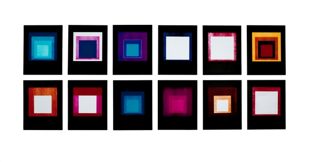 Jason Kalogiros’ photograms, created through a camera-less photographic process, investigate Josef Albers' seminal study of color theory, Interaction of Color (pub. 1963), and a 1965 edition of his Homage to the Square print series. His interest in the work of Albers springs from Kalogiros’ broader research into the history of photography. His photograms are chromatic inversions of the prints and color studies on which they are based, thereby embodying optical effects at the heart of much of Albers’s teaching and writing.
